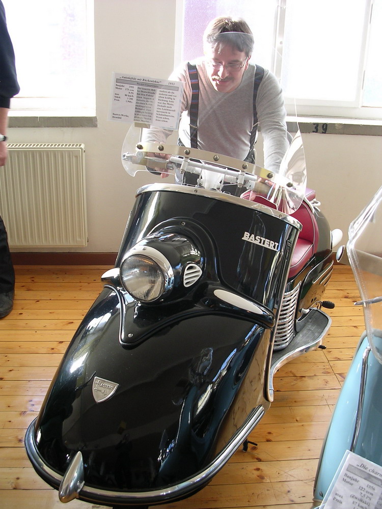 Dachte ich doch, das Gesicht kommt mir bekannt vor. Bastert Einspurauto hieß das Teil, das der Nager interessiert betrachtet. Ziemlich selten. Noch rarer ist der Kroboth. Und das runde blaue Ding auf dem unteren Foto dürfte eine Triumph Tessy sein. Schönes Musäum. Leider ist bei mir morgen Schafe Schaffe angesagt.