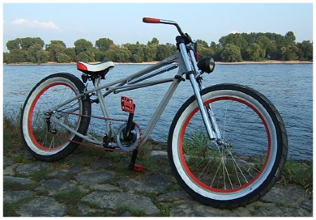 Aha, das Raketenfahrrad, ich hab auch noch eins, ein Retro-Eigenbau-Boardtracker, mit Honda-Einzylinder :