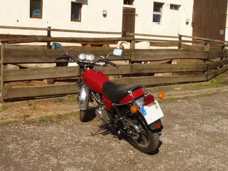 Was passierte? Keine 10 km und beim ersten Stop steht beim Luft kontrollieren plötzlich ein Typ neben mir, Rucksack, Halbglatze, Brille, Grinsen im Gesicht und meint nur: "Die ist aber schön! Wie alt ist die?" Es folgte der obligate kleine Plausch, dass es sich hier nicht um ein Nachkriegsmodell handelt, die Dinger leider immer seltener werden usw.