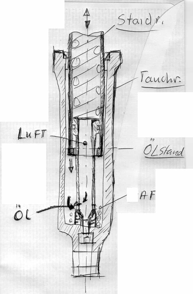 Wenn zu wenig (wieviel habe ich nicht gemessen) Öl im Dämpfbereich ist ragt die Luftausgleichsbohrung im Kolben oben über den Ölpegel.